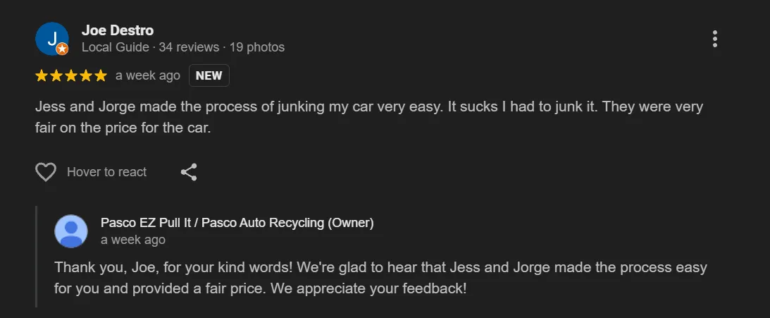 “Fast, honest, no pressure. The offer was better than the junk car sites.”